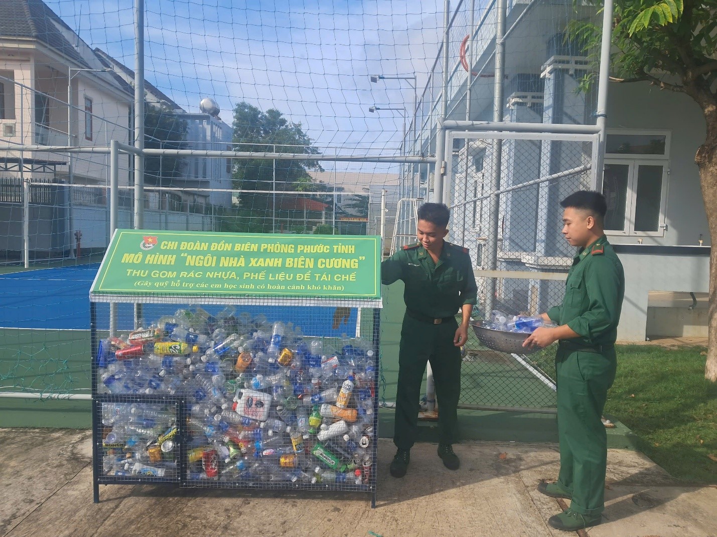 Chiến sĩ Đồn Biên phòng Phước Tỉnh thu gom rác nhựa, phế liệu để tái chế và làm đẹp cảnh quang môi trường đô thị tại buổi ra mắt mô hình “Ngôi nhà xanh Biên cương”.