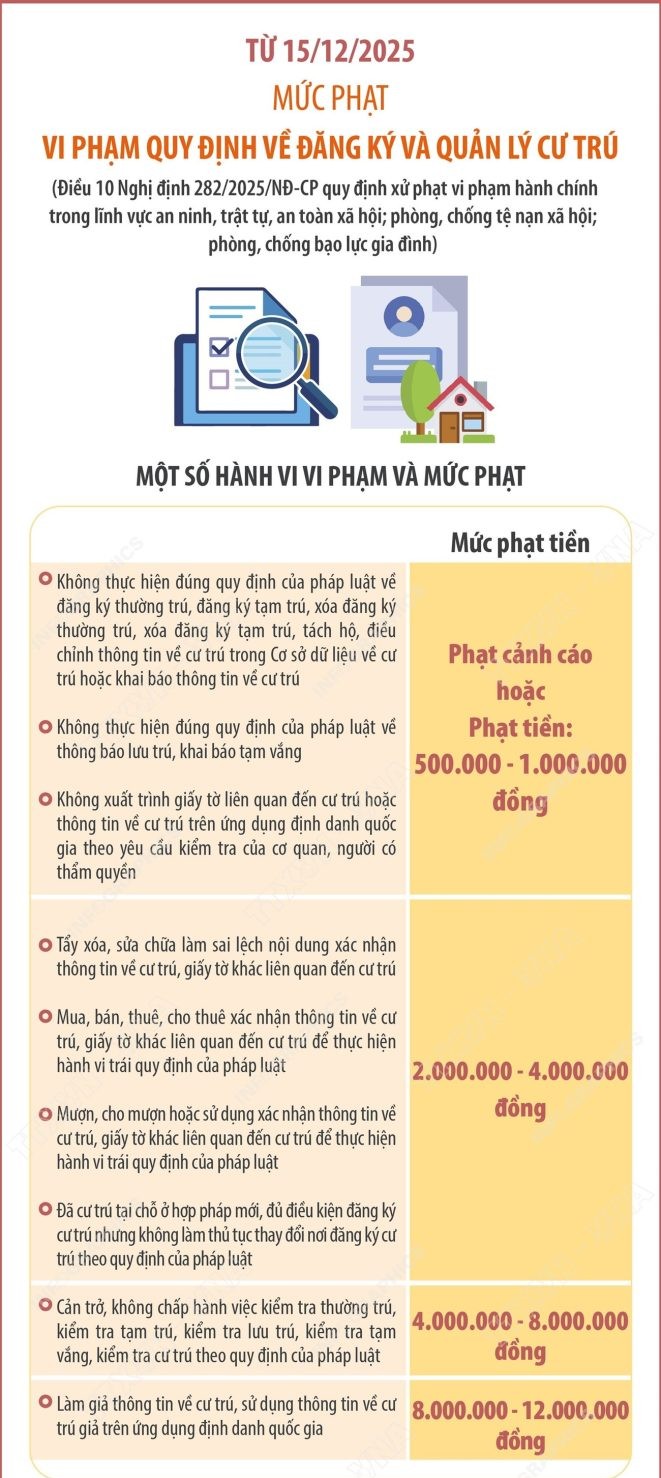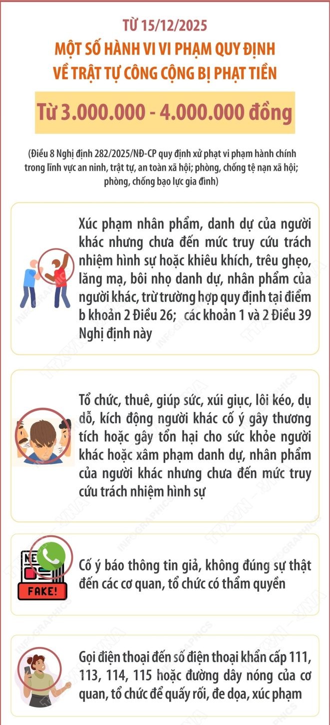 Từ ngày 15/12/2025, Nghị định số 282/2025/NĐ-CP của Chính phủ chính thức có hiệu lực, quy định chi tiết về xử phạt vi phạm hành chính trong lĩnh vực an ninh, trật tự, an toàn xã hội; phòng, chống tệ nạn xã hội; phòng, chống bạo lực gia đình. Trong đó, nhiều hành vi vi phạm trật tự công cộng sẽ bị xử phạt nghiêm khắc hơn, với mức phạt tiền từ 500.000 đồng đến tối đa 40 triệu đồng, tùy theo tính chất, mức độ vi phạm.